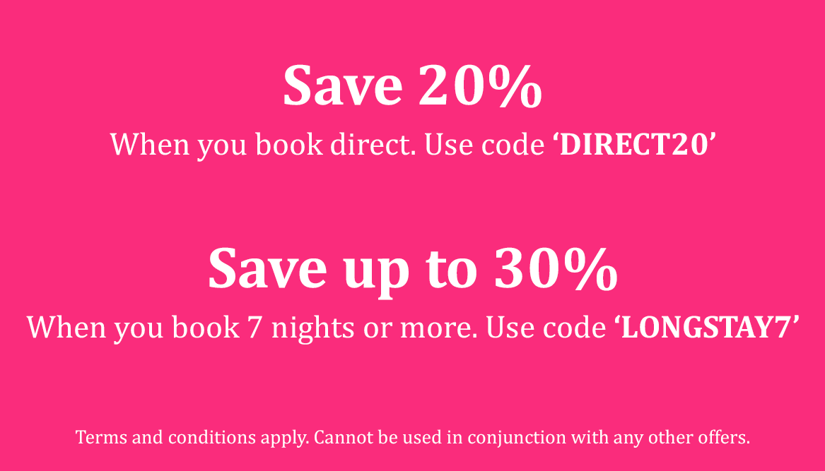 Book your luxury stay with us for a minimum of 7 nights and enjoy a super-suite saving of up to 30% (using LONGSTAY7 promo code).